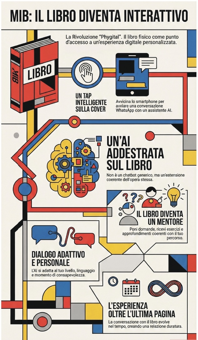 Message In a Book è il libro che diventa interattivo. Nasce dall'incontro tra la concretezza del libro fisico e le potenzialità del digitale, dando vita a un'esperienza di lettura più ricca, dinamica e personale. Il libro non è più soltanto un oggetto da sfogliare o un contenuto da consultare, ma diventa un vero punto di accesso a un dialogo continuo con il lettore. Attraverso un semplice tap sulla cover, è possibile avviare una conversazione WhatsApp con un assistente AI addestrato sul contenuto specifico dell'opera, capace di accompagnare la lettura in modo coerente, contestuale e personalizzato. Questo significa poter fare domande, chiarire concetti, approfondire temi, ricevere esercizi, spunti di riflessione e contenuti utili in base al proprio livello, ai propri interessi e al momento che si sta vivendo. In questo modo, MIB trasforma il libro in un'esperienza viva, che continua anche oltre l'ultima pagina: non solo lettura, ma relazione, crescita e accompagnamento nel tempo.